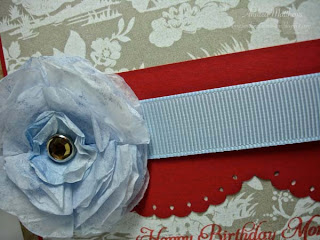 The red, scalloped cardstock was stamped in text with Spring rain for a subtle look, however, it didn't translate in the photo... boo.... Looks much better IRL. The flower is made of tissue paper that was inked with colorbox pigment ink.